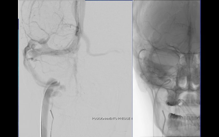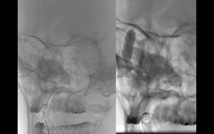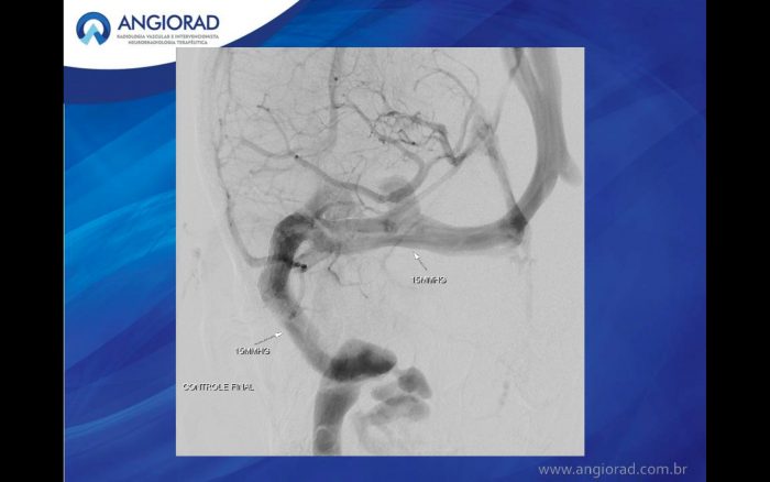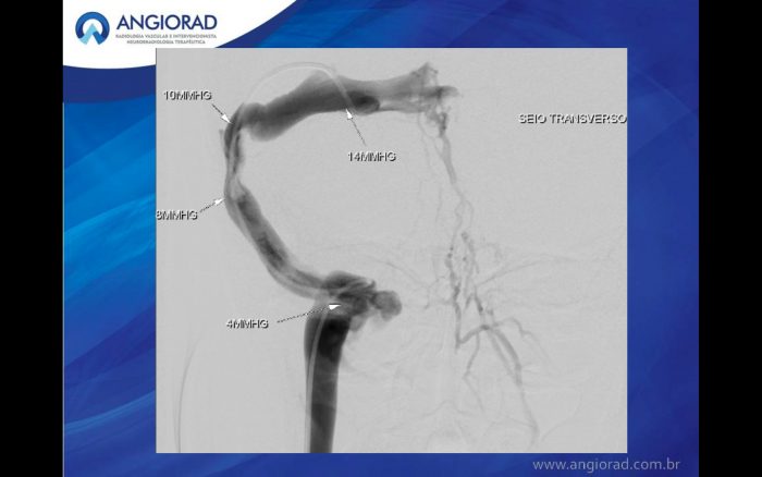 O caso ilustrado é de uma paciente de 33 anos com papiledema, cefaleia intensa, zumbido e perda progressiva do campo visual. Foram realizadas aferioções da pressão em todo trajeto do seio transverso e sigmoide direito, sendo evidenciado diferença de pressão de 10 mm/Hg relacionada ao ponto de estenose. Após o diagnóstico, foi instituído o tratamento por angioplastia com Stent (Precise – Cordis), devido sua facilidade de navegação e acomodação em tortuosidades. O procedimento transcorreu sem intercorrências, havendo resolução completa dos sintomas após 30 dias.