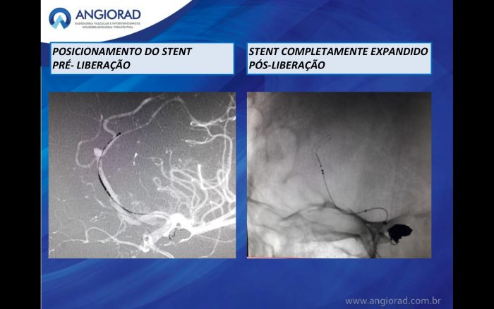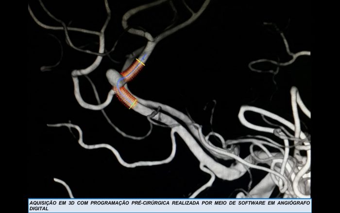 Os stents redirecionadores de fluxo  foram inicialmente desenvolvidos para o tratamento de aneurismas de colo largo localizados na carótida interna supraclinoidea. Para aneurismas pequenos, a taxa de oclusão completa tardia é superior a 90% e a taxa de complicação é menor que 5%. Sua utilização no território extracarotídeo ainda é motivo de discussão na literatura, contudo a  já demonstra resultados promissores e sucesso nesses territórios. Esse caso foi  optado por tratamento endovascular com stent redicerionador de fluxo (FRED® Jr. System Flow Re-Direction Endoluminal).