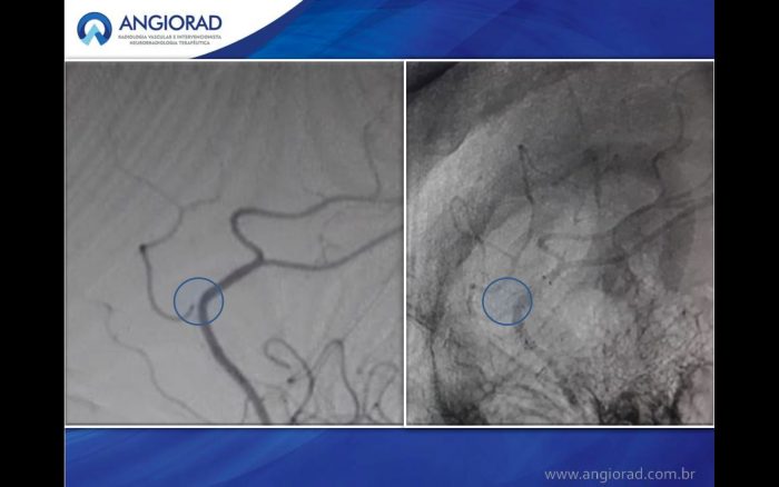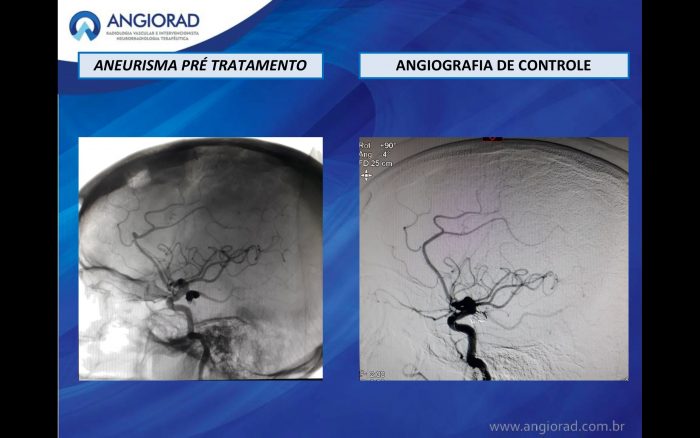 O caso descrito apresenta oclusão completa do aneurisma e preservação vascular após controle angiográfico com 6 meses.
