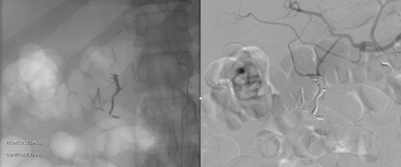 Paciente seguiu com queda da hemoglobina apesar dos 2 tratamentos realizados por via endoscópica. Foi solicitada então avaliação da equipe da radiologia intervencionista para realização de angiografia.